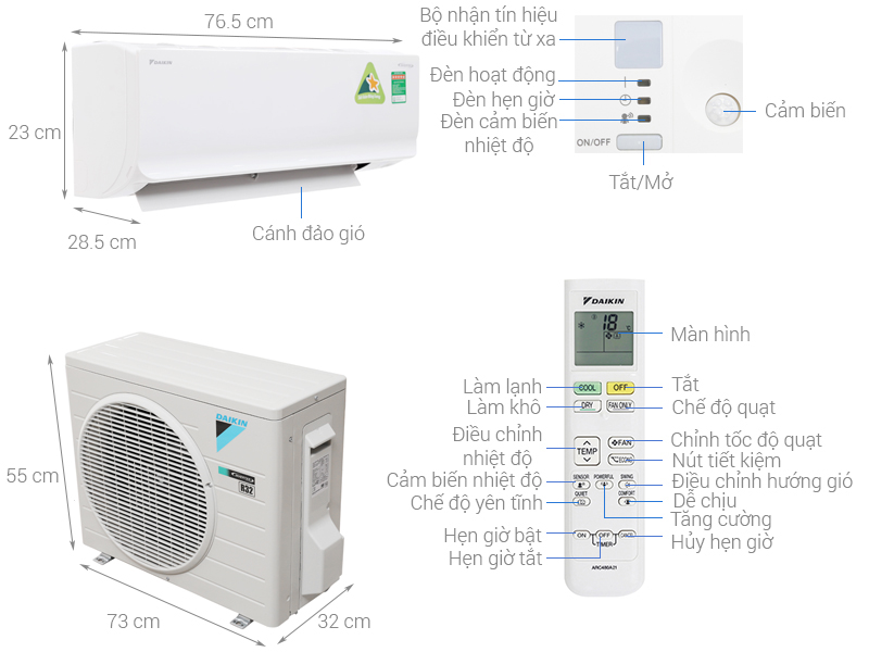 Chế độ chỉ sử dụng quạt Fan Only - chỉ làm mát, không làm lạnhChức năng chống ẩm mốc bảo vệ sức khỏeChức năng hút ẩmCánh tản nhiệt dàn nóng chống ăn mònDàn nóng được trang bị thêm bo mạch để bảo vệ khi điện áp thay đổiHoạt động siêu êm QuietHẹn giờ bật tắt máyKhóa remote điều khiểnLuồng gió thoải mái CoandaMáng nước có thể tháo rời (dễ vệ sinh dàn lạnh)Thổi gió dễ chịu (cho trẻ em, người già)Tùy chọn mua thêm bộ điều khiển không dây Daikin MobileTự khởi động lại khi có điện -