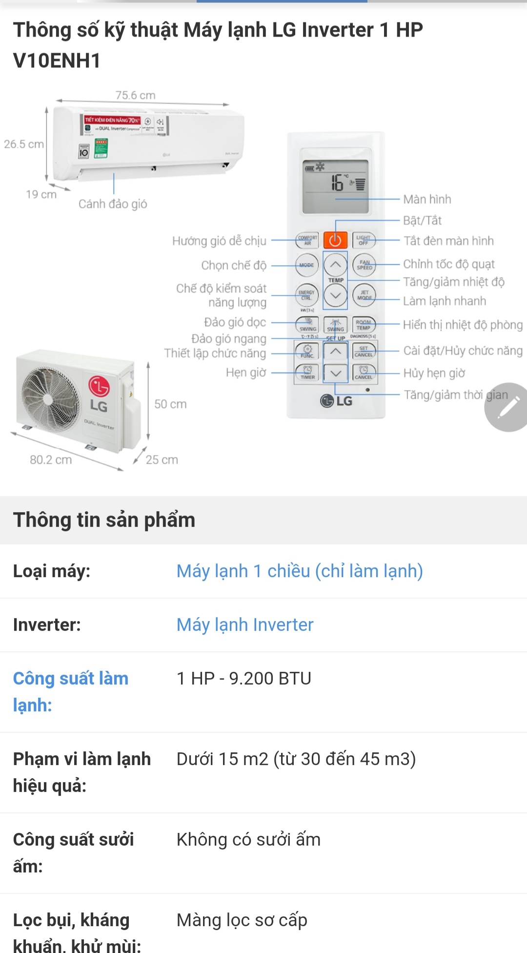 - Mã sản phẩm: Máy lạnh LG Inverter 1 HP V10WIN