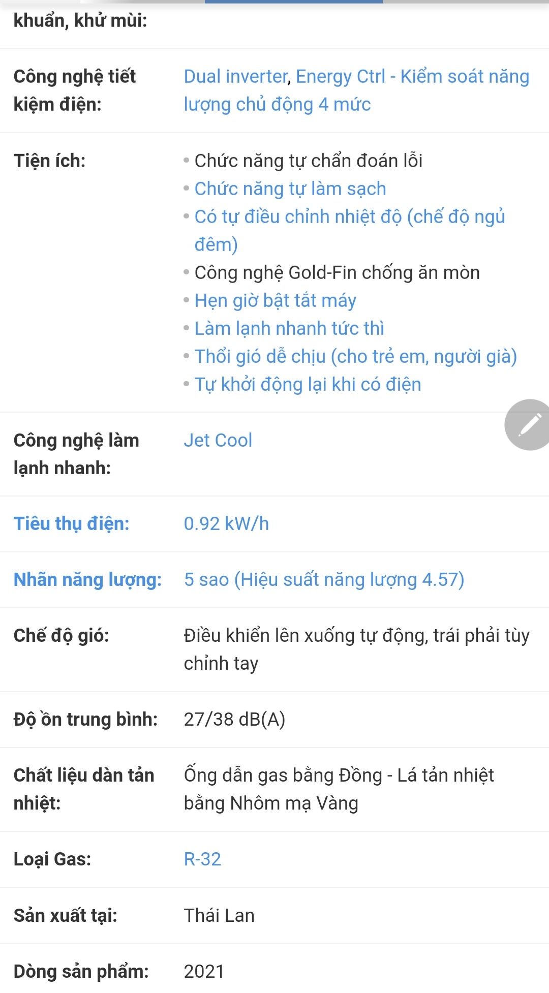 0.92 kW/h5 sao (Hiệu suất năng lượng 4.57) -