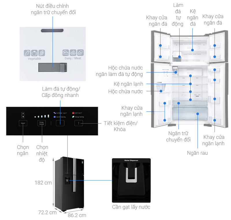 Đệm cửa chống mốcLàm lạnh nhanhChế độ cấp đông nhanhChuông báo khi quên đóng cửaBảng điều khiển bên ngoài