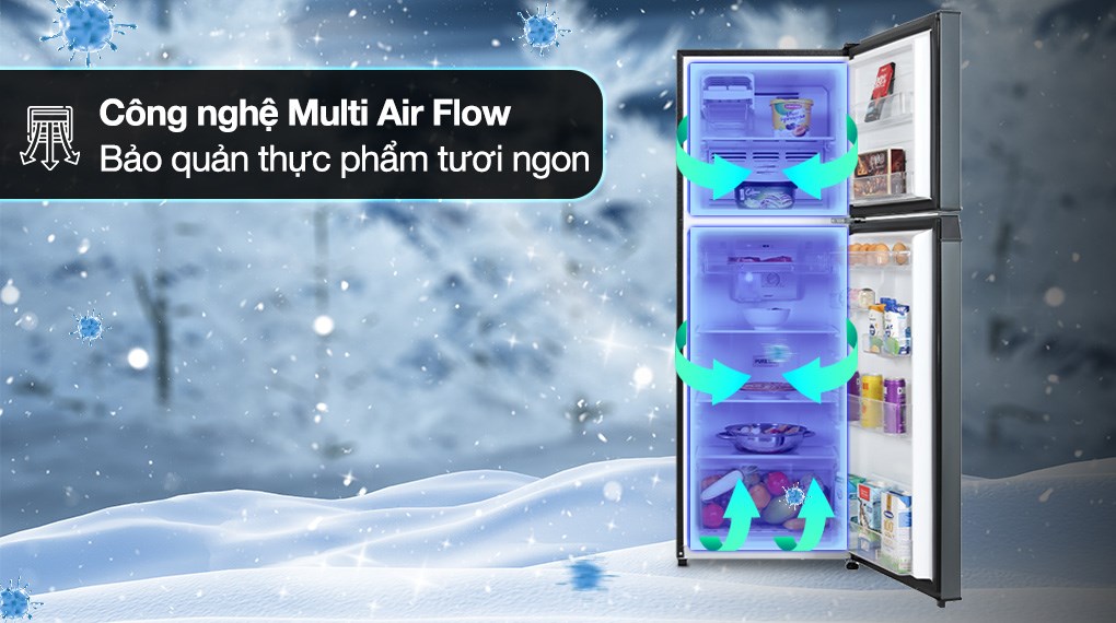 - Công nghệ Multi Air Flow: Khí lạnh được tỏa ra vừa đủ để phân bổ đến mọi vị trí bên trong giữa các ngăn tủ. Nhờ đó kéo dài thời gian bảo quản thực phẩm lâu hơn cũng như hạn chế tình trạng hơi lạnh không được tỏa đồng đều giữa các ngăn.