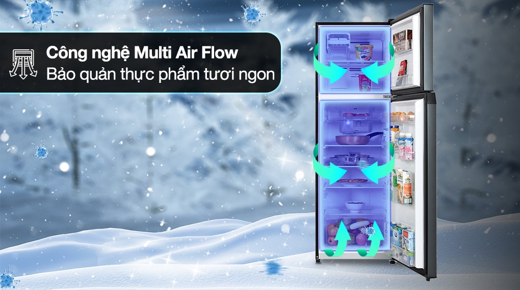 - Công nghệ Multi Air Flow: Phân bổ và tỏa đều khí lạnh khắp mọi vị trí tại các ngăn tủ lạnh, giảm thiểu tình trạng không đồng đều giữa các ngăn và góp phần kéo dài thời gian bảo quản thực phẩm lâu hơn.