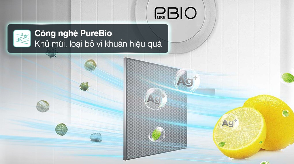 Công nghệ PureBio: được cấu tạo từ gốm Ceramic và phủ lớp tinh thể Bạc (Ag+) nên bộ lọc này có khả năng diệt khuẩn và khử mùi hôi thực phẩm hiệu quả. Nhờ vậy góp phần làm cho không gian bên trong tủ lạnh luôn được thông thoáng và bảo quản thực phẩm tốt hơn.