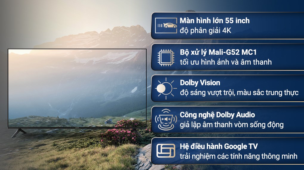 - Công nghệ Dolby Vision điều chỉnh độ sáng, màu sắc, độ tương phản một cách tự động nhằm tạo nên khung hình chuẩn điện ảnh, sống động như thật.