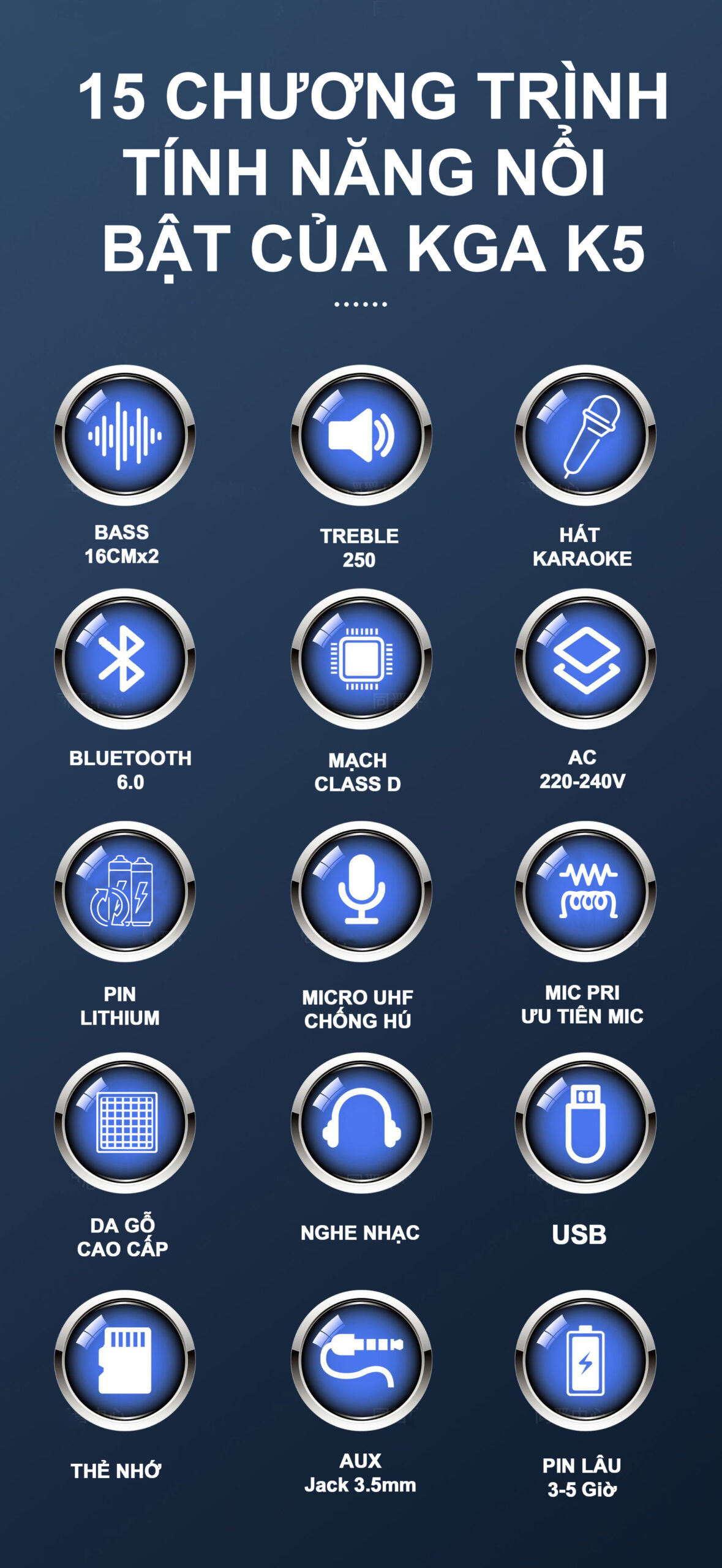 Được đi kèm với một bộ micro không dây UHF nhôm cao cấp chống hú tối đa chất lượng, loa xách tay KGA K-5 mang lại khả năng hát karaoke hoàn hảo, chuyên nghiệp. Được đúc nhôm nguyên khối nhập khẩu châu Âu và lớp hoàn thiện màu đen sang trọng cho khả năng cầm chắc tay, cùng những tinh chỉnh trên loa, cặp micro không dây tái tạo tiếng hát trong veo, bay bổng và nhẹ nhàng.