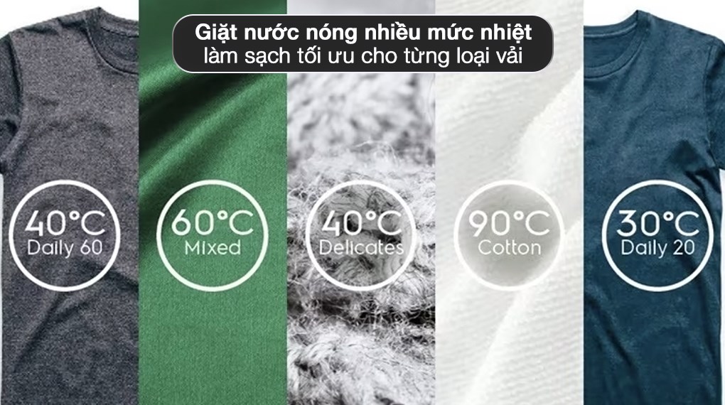 - Thiết bị có thể chọn chu trình giặt với 6 mức nhiệt khác nhau tùy theo từng loại vải để đảm bảo giặt quần áo sạch đúng cách, giữ chất liệu bền lâu hơn.