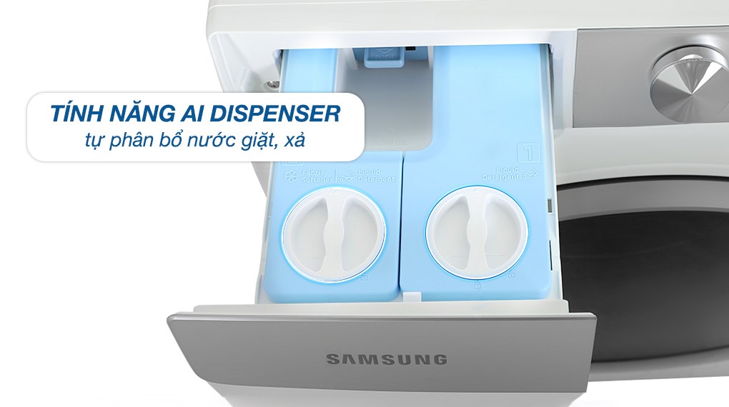 - Ngăn chứa nước giặt xả AI Dispenser: Tự động cân chỉnh lượng nước giặt xả bên trong ngăn chứa phù hợp với khối lượng và độ bẩn quần áo trong suốt chu trình giặt xả. Bạn chỉ cần đổ 1 lần nước giặt xả vào trong ngăn AI Dispenser là máy có thể tự động cân chỉnh sử dụng lên đến 1 tháng (tương đương với tần suất 4 lần giặt/tuần) mà bạn không cần phải thao tác theo cách thủ công.