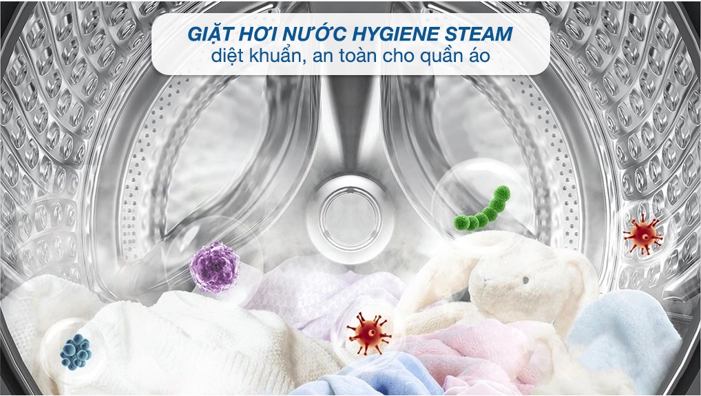 - Giặt hơi nước Hygiene Steam diệt 99.9% vi khuẩn: Sử dụng hơi nước có nhiệt độ cao thấm sâu vào bên trong sợi vải, từ đó tăng cường khả năng diệt khuẩn đến 99.9% cùng với các chất gây dị ứng tối đa. Vì thế công nghệ này góp phần bảo vệ sức khỏe làn da của người dùng tốt hơn.