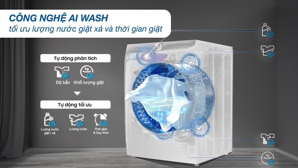 - Công nghệ AI Wash: Sử dụng 5 loại cảm biến có khả năng nhận biết chất liệu, độ bẩn và khối lượng quần áo, từ đó tự động tùy chỉnh lượng nước giặt xả, nước sử dụng và thời gian để tối ưu quá trình giặt giũ mà vẫn đảm bảo được tiêu chí giặt sạch quần áo.